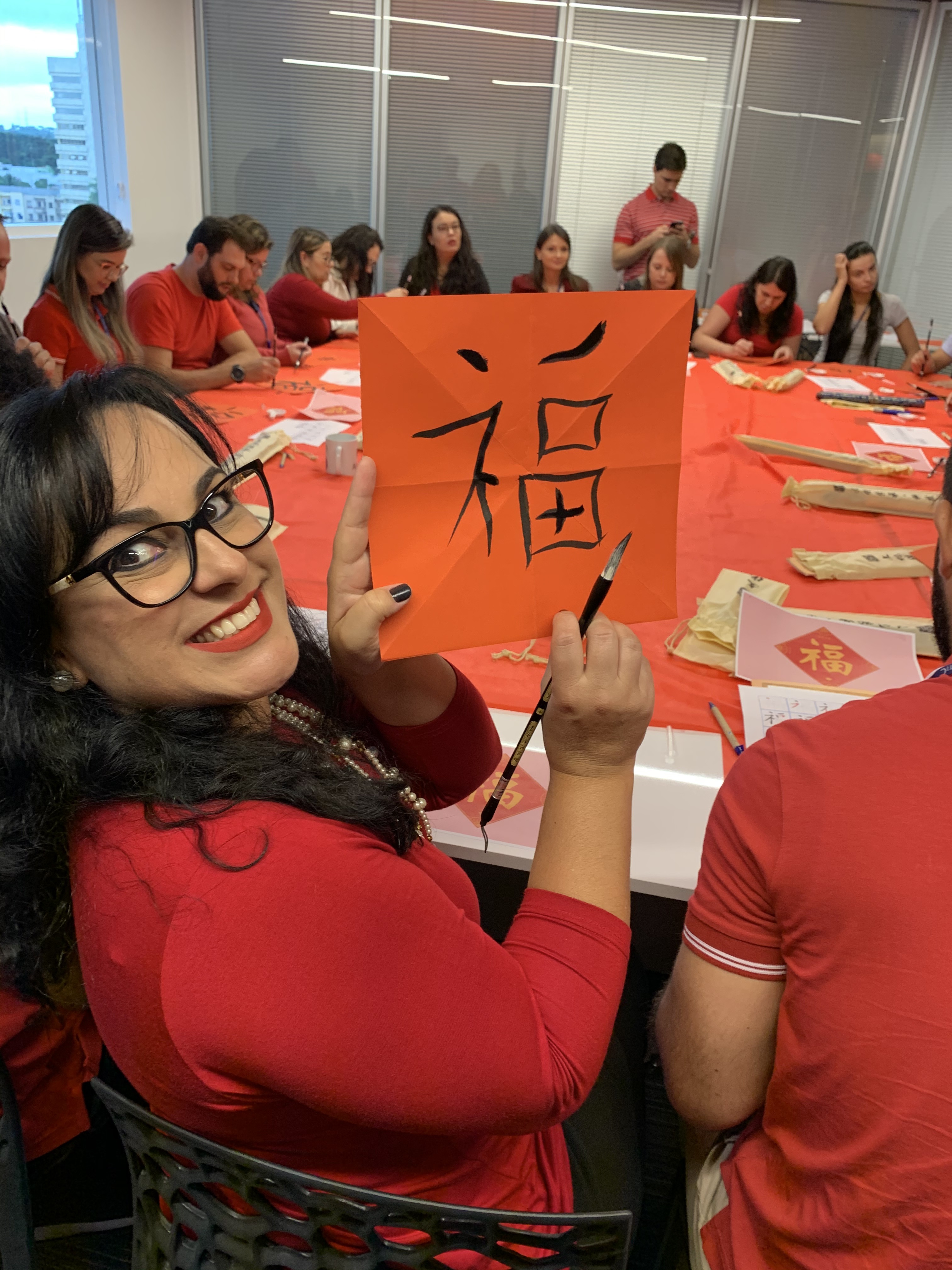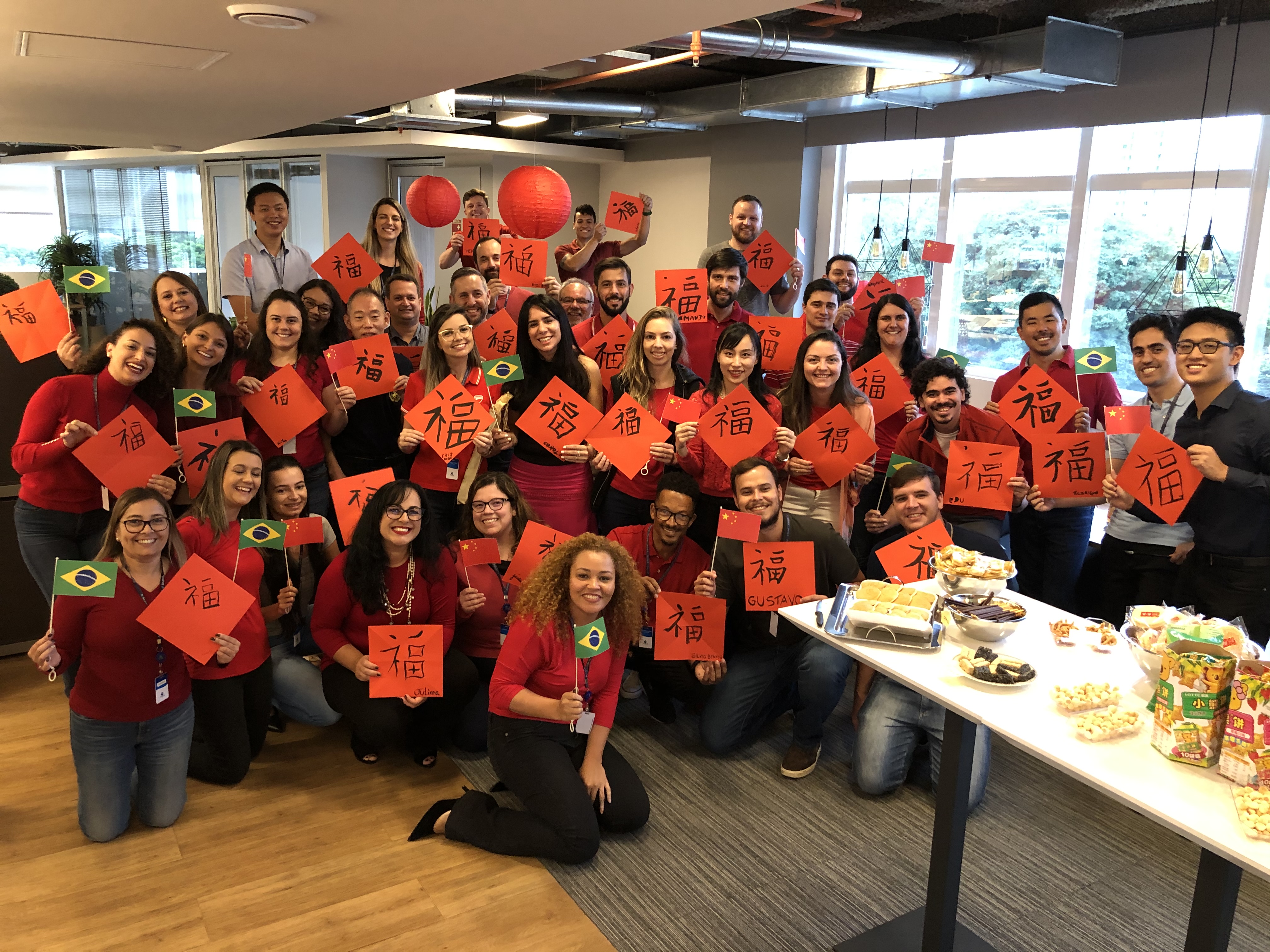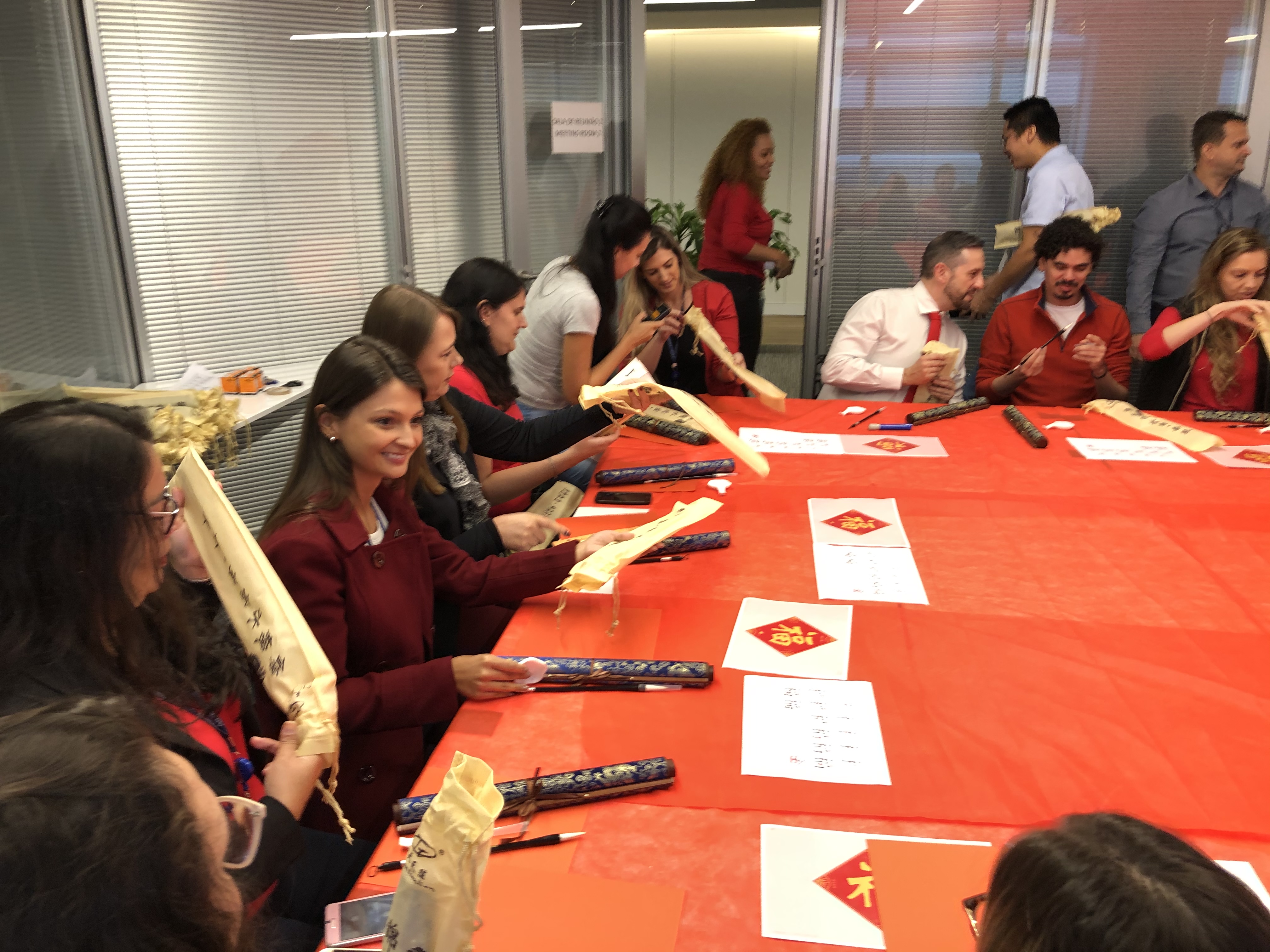 2020年1月17日,巴西公司組織“新春送福”活動。圖為員工們展示作品合影。